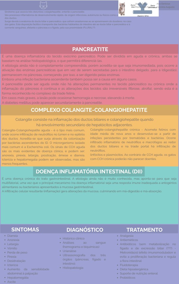 Síndrome que associa três distúrbios: colagiohepatite, enterite e pancreatite. São processos inflamatórios de desenvolvimento rápido, de origem infecciosa, autoimune ou físicos como a obstrução dos ductos. Surge devido à anatomia do ducto biliar e pancreatico, que sofrem anastomose ao se aproximarem do duodeno, no caso dos gatos. Esta disposição facilita o transporte das bactérias habitantes do intestino até ao ducto biliar e pancreático e à corrrente sanguínea, afetanto o pâncreas e o fígado, pela sua proximidade (PLURAL??).