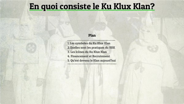 1. Les symboles du Ku Klux Klan2.Quelles sont les pratiques du KKK 3. Les Icônes du Ku Klux Klan 4. Financement et Recrutement 5. Qu'est devenu le Klan aujourd'hui