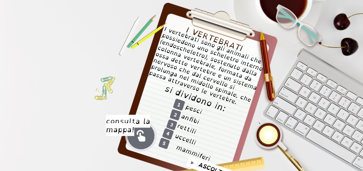 i pesci sono vertebrati che vivono in acqua, hanno il corpo ricoperto di squame scivolose, dotato di coda e di pinne che consentono il movimento. Con le branchie respirano l'ossigeno disciolto in acqua. Hanno un particolare organo di senso, la linea laterale, che gli permette di avvertire i pericoli. Sono animali ovipari ed eterotermi.