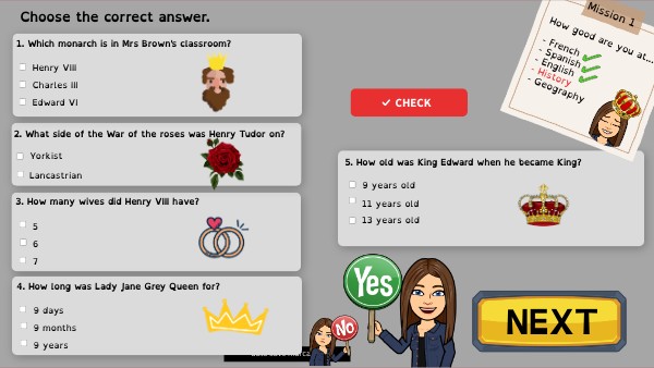 1. Which monarch is in Mrs Brown's classroom?