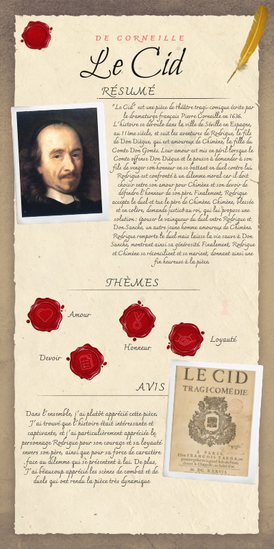 Dans l'ensemble, j'ai plutôt apprécié cette pièce. J'ai trouvé que l'histoire était intéressante et captivante, et j'ai particulièrement appréciée le personnage Rodrigue pour son courage et sa loyauté envers son père, ainsi que pour sa force de caractère face au dilemme qui se présentent à lui. De plus, J'ai beaucoup apprécié les scènes de combat et de duels qui ont rendu la pièce très dynamique