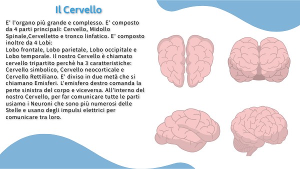 E' l'organo più grande e complesso. E' composto da 4 parti principali: Cervello, Midollo Spinale,Cervelletto e tronco linfatico. E' composto inoltre da 4 Lobi: Lobo frontale, Lobo parietale, Lobo occipitale e Lobo temporale. Il nostro Cervello è chiamato cervello tripartito perchè ha 3 caratteristiche: Cervello simbolico, Cervello neocorticale e Cervello Rettiliano. E' diviso in due metà che si chiamano Emisferi. L'emisfero destro comanda la perte sinistra del corpo e viceversa. All'interno del nostro Cervello, per far comunicare tutte le parti usiamo i Neuroni che sono più numerosi delle Stelle e usano degli impulsi elettrici per comunicare tra loro.