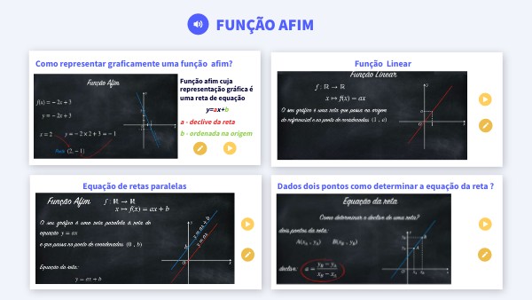 Função afim cuja representação gráfica é uma reta de equação y=ax+b a - declive da reta b - ordenada na origem