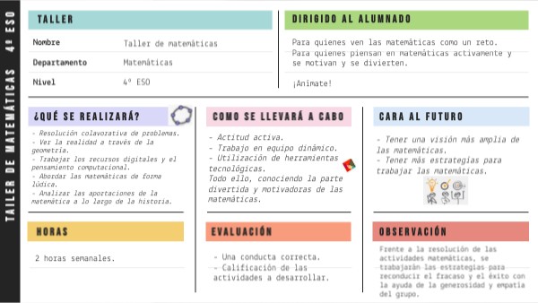 - Resolución colavorativa de problemas. - Ver la realidad a través de la geometría. - Trabajar los recursos digitales y el pensamiento computacional. - Abordar las matemáticas de forma lúdica. - Analizar las aportaciones de la matemática a lo largo de la historia.