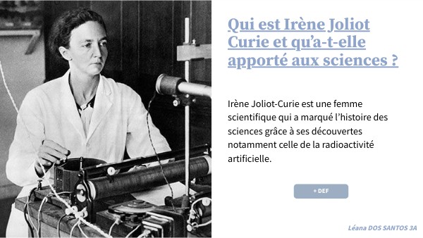 Irène Joliot-Curie est une femme scientifique qui a marqué l’histoire des sciences grâce à ses découvertes notamment celle de la radioactivité artificielle.