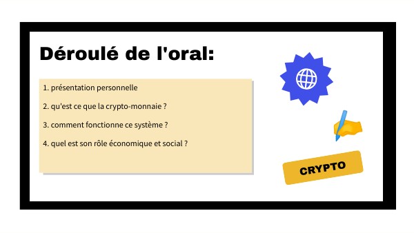 1. présentation personnelle 2. qu'est ce que la crypto-monnaie ? 3. comment fonctionne ce système ? 4. quel est son rôle économique et social ?