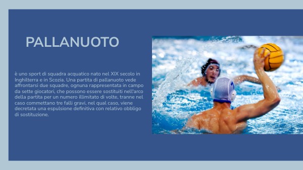 è uno sport di squadra acquatico nato nel XIX secolo in Inghilterra e in Scozia. Una partita di pallanuoto vede affrontarsi due squadre, ognuna rappresentata in campo da sette giocatori, che possono essere sostituiti nell'arco della partita per un numero illimitato di volte, tranne nel caso commettano tre falli gravi, nel qual caso, viene decretata una espulsione definitiva con relativo obbligo di sostituzione.
