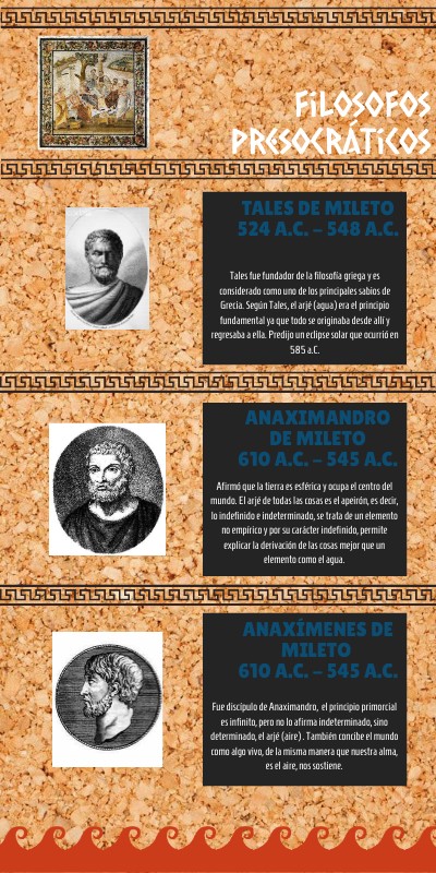 Tales fue fundador de la filosofía griega y es considerado como uno de los principales sabios de Grecia. Según Tales, el arjé (agua) era el principio fundamental ya que todo se originaba desde allí y regresaba a ella. Predijo un eclipse solar que ocurrió en 585 a.C.