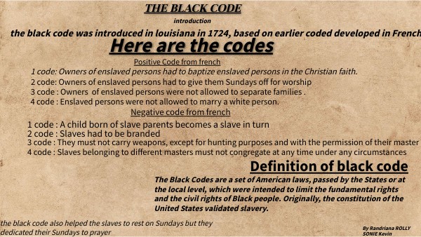 The Black Codes are a set of American laws, passed by the States or at the local level, which were intended to limit the fundamental rights and the civil rights of Black people. Originally, the constitution of the United States validated slavery.