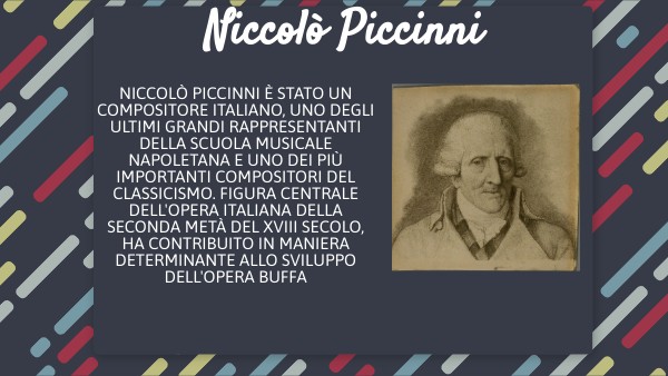 Niccolò Piccinni è stato un compositore italiano, uno degli ultimi grandi rappresentanti della scuola musicale napoletana e uno dei più importanti compositori del Classicismo. Figura centrale dell'opera italiana della seconda metà del XVIII secolo, ha contribuito in maniera determinante allo sviluppo dell'opera buffa