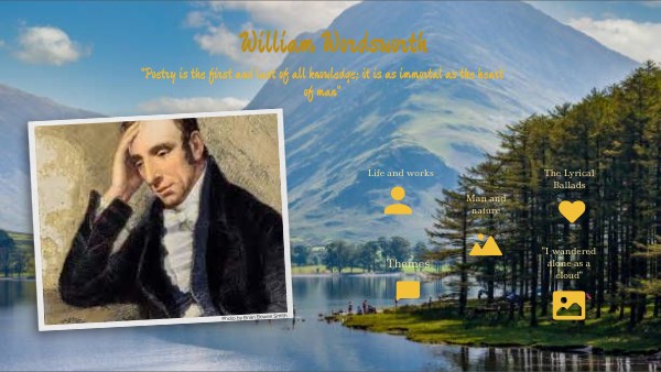 MAN AND NATURE Wordsworth was defined as a "poet of English nature", but he was not interested in the natural world and the observation of its phenomena but rather the relationship between the natural world and human consciousness, with the influences, sensations and emotions that derive from this interaction. One of the most important concepts for him is the idea that man and nature are inseparable, that man does not exist outside the natural world but is part of it. Men learn love, happiness and beauty when they look at the natural elements.