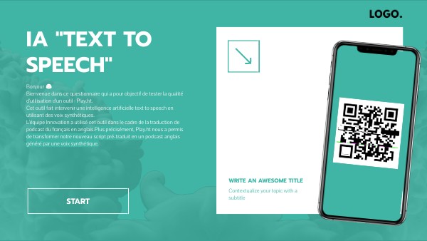 Bonjour đ Bienvenue dans ce questionnaire qui a pour objectif de tester la qualitĂ© d'utilisation d'un outil : Play.ht. Cet outil fait intervenir une intelligence artificielle text to speech en utilisant des voix synthĂ©tiques. L'Ă©quipe Innovation a utilisĂ© cet outil dans le cadre de la traduction de podcast du français en anglais.Plus prĂ©cisĂ©ment, Play.ht nous a permis de transformer notre nouveau script prĂ©-traduit en un podcast anglais gĂ©nĂ©rĂ© par une voix synthĂ©tique.