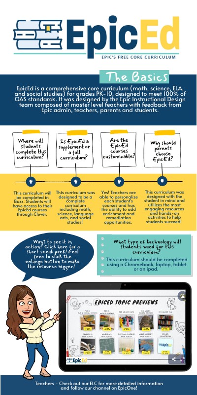 EpicEd is a comprehensive core curriculum (math, science, ELA, and social studies) for grades PK-10, designed to meet 100% of OAS standards. It was designed by the Epic Instructional Design team composed of master level teachers with feedback from Epic admin, teachers, parents and students.