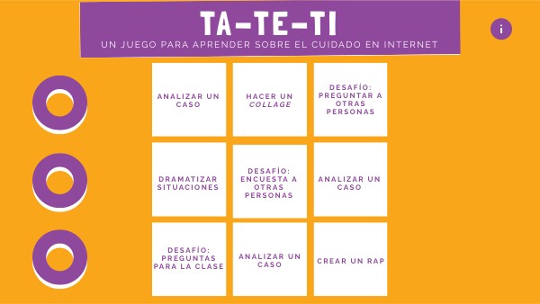 En equipo, diseñen un juego para concientizar acerca de la importancia de cuidarse a uno mismo y a los demás en internet. Algunas opciones para inspirarse: