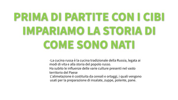 I CIBI PRINCIPALI DELLA RUSSIA SONO-I BLINI -GOLUBSTY -INSALATA OLIVER -KOTLETY -BORSCH - MANZO ALLA STROGANOF