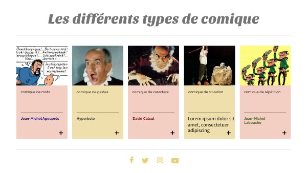 Le personnage fait rire le public tout en parlant et exploite les ressources du langage : répétitions, jeux de mots, calembours, déformations, accents, recours au jargon, défaut de prononciation (bégaiement, zézaiement) aux dialectes.