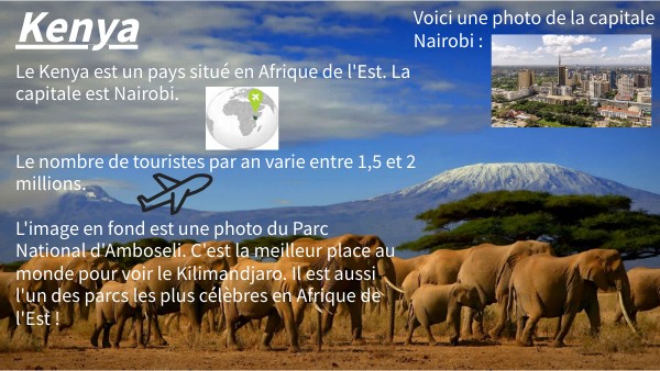 Le Kenya est un pays situé en Afrique de l'Est. La capitale est Nairobi. Le nombre de touristes par an varie entre 1,5 et 2 millions.