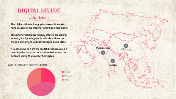 The digital divide is the gap between those who have access to the Internet and those who don't. This phenomenon particularly affects the elderly, women, immigrants, people with disabilities and those belonging to a disadvantaged social class. It is essential to fight the digital divide, because it has negative impacts on social inclusion and on people's ability to exercise their rights.
