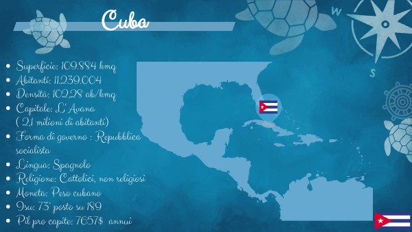 Cuba confina a sud con il Mar dei Caraibi, a est con l'Oceano Atlantico e a ovest con il golfo del Messico. Il territorio oltre ad essere in prevalenza pianeggiante, a sud, nella Sierra Maestra presenta dei rilievi di modesta altitudine. Il clima è temperato e umido con temperature elevate. La crescita della foresta pluviale è caratterizzata dalle abbondanti precipitazioni. Inoltre d'estate violenti uragani raggiungono l'isola. La popolazione urbanizzata è composta prevalentemente da bianchi, meticci, ma è consistente la quota di neri. La città più popolosa è la capitale Avana (contiene 2,1 milioni di abitanti) seguita da Santiago de Cuba (circa mezzo milione di abitanti).