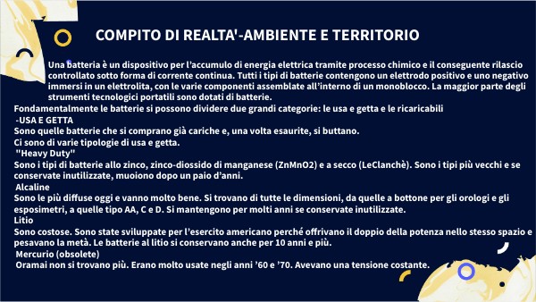 SMALTIMENTO DELLE BATTERIE Le batterie rappresentano sicuramente un’invenzione tecnologica di grande importanza che ha permesso all’uomo di sviluppare una tecnologia portatile che, senza questi strumenti, non avrebbe avuto la diffusione odierna. Se da un lato, le batterie hanno contribuito allo sviluppo della tecnologia, dall’altro creano un grande problema per l’ambiente. Le pile, infatti, sono molto inquinanti per l’ambiente, perché contengono, metalli pesanti come mercurio, cadmio, piombo e cromo. Se le pile vengono smaltite nell’indifferenziata, o peggio abbandonate in una discarica abusiva, sono in grado di inquinare fortemente le acque: basti pensare che un solo grammo inquina ben 1.000 litri di acqua. Risulta quindi evidente la necessità di smaltire le batterie in modo giusto per salvaguardare l’ambiente e la nostra salute. Nella gran parte dei casi, ognuno di noi si trova a dover smaltire batterie che alimentano oggetti di uso quotidiano come calcolatrici, orologi e telecomandi. La legge impone ai produttori di finanziare un sistema di raccolta delle pile esauste, che avviene in modalità diverse a seconda della categoria di appartenenza e che deve essere in ogni caso gratuito per tutti. La prima regola per un corretto smaltimento è che non bisogna mai buttare le pile nella spazzatura indifferenziata. Questo causerebbe un gravissimo danno all’ambiente. Ma come smaltire correttamente pile e batterie usate? Ci sono diversi luoghi dove è possibile portare le pile per lo smaltimento: in un’isola ecologica del gestore dei rifiuti urbani o in un negozio autorizzato alla raccolta oppure ancora nei punti di raccolta presenti nelle principali strade di tutte le città