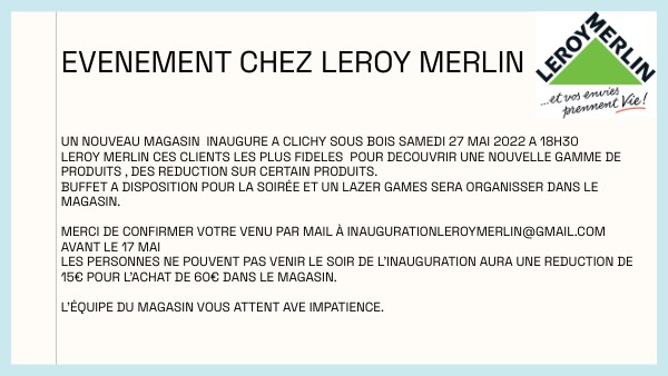 Un nouveau magasin inaugure a clichy sous bois samedi 27 mai 2022 a 18h30 LEROy merlin ces clients les plus fideles pour decouvrir une nouvelle gamme de produits , des reduction sur certain produits. Buffet a disposition pour la soirée et un lazer games sera organisser dans le magasin. merci de confirmer votre venu par mail à inaugurationleroymerlin@gmail.com avant le 17 mai les personnes ne pouvent pas venir le soir de l'inauguration aura une reduction de 15€ pour l'achat de 60€ dans le magasin. L'équipe du magasin vous attent ave impatience.