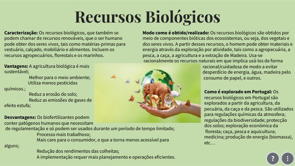 Como é explorado em Portugal: Os recursos biológicos em Portugal são explorados a partir da agricultura, da pecuária, da caça e da pesca. São utilizados para regulações químicas da atmosfera; regulações da biodiversidade; protecção dos solos; exploração económica da floresta; caça, pesca e aquicultura; medicina; produção de energia (biomassa), etc…