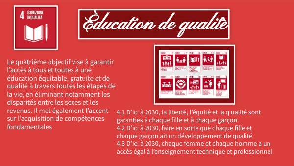 Le quatrième objectif vise à garantir l’accès à tous et toutes à une éducation équitable, gratuite et de qualité à travers toutes les étapes de la vie, en éliminant notamment les disparités entre les sexes et les revenus. Il met également l’accent sur l’acquisition de compétences fondamentales