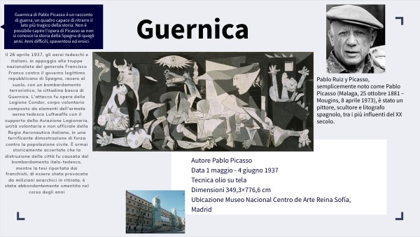 Guernica di Pablo Picasso è un racconto di guerra, un quadro capace di ritrarre il lato più tragico della storia. Non è possibile capire l'opera di Picasso se non si conosce la storia della Spagna di quegli anni. Anni difficili, spaventosi ed eroici.