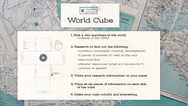 1. Pick a city anywhere in the world(outside of the USA) 2. Research to find out the following: -Location (continent, country, hemispheres) -3 places of interest to visit in the city -historical fact -climate/ resources (what is it known for?) - picture or symbol3. Write your research information on your paper. 4. Place all six pieces of information on each side of the cube. 5. Make your cube colorful and interesting.