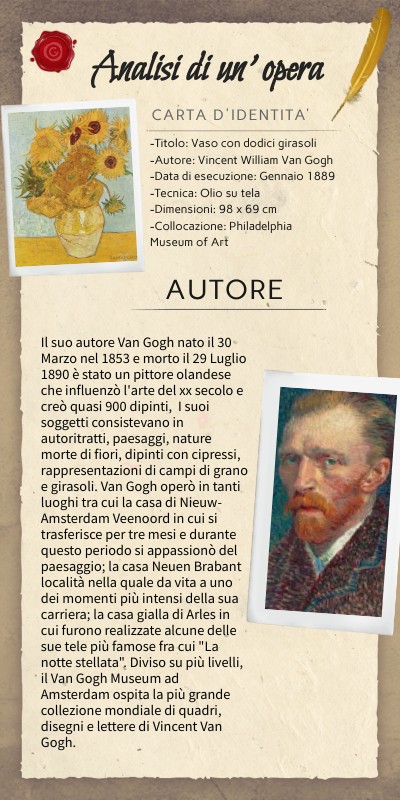 -Titolo: Vaso con dodici girasoli -Autore: Vincent William Van Gogh -Data di esecuzione: Gennaio 1889 -Tecnica: Olio su tela -Dimensioni: 98 x 69 cm -Collocazione: Philadelphia Museum of Art