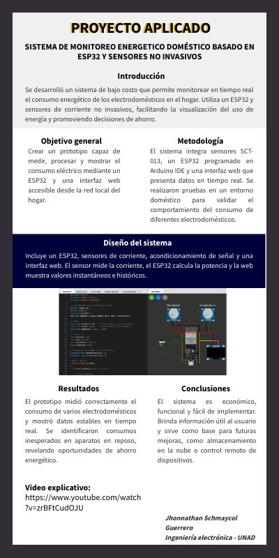 Se desarrolló un sistema de bajo costo que permite monitorear en tiempo real el consumo energético de los electrodomésticos en el hogar. Utiliza un ESP32 y sensores de corriente no invasivos, facilitando la visualización del uso de energía y promoviendo decisiones de ahorro.