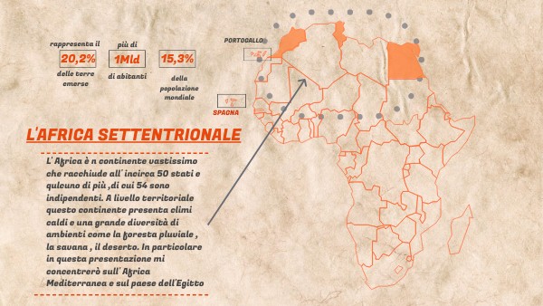 L' Africa è n continente vastissimo che racchiude all' incirca 50 stati e qulcuno di più ,di cui 54 sono indipendenti. A livello territoriale questo continente presenta climi caldi e una grande diversità di ambienti come la foresta pluviale , la savana , il deserto. In particolare in questa presentazione mi concentrerò sull' Africa Mediterranea e sul paese dell'Egitto