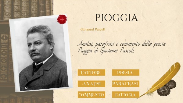 Giovanni Pascoli nacque il 31 dicembre del 1855 a San Mauro di Romagna, in Provincia di Forlì.Dopo la morte del padre, ucciso in un agguato durante il suo ritorno a Cesena fu costretto ad entrare nel mondo adulto. Nel 1879 fu arrestato per aver partecipato a una manifestazione in favore degli anarchici. Liberato, iniziò l'attività di insegnante di lettere latine e greche prima a Matera, poi a Marsa e infine a Livorno. Qualche anno dopo si ammalò gravemente e morì a Bologna nel 1912. Pascoli è conosciuto per molte delle sue opere tra quali: "I Canti di Castelvecchio", i "Poemi conviviali", i "Primi e i Nuovi poemetti", le "Odi" e "Inni" e i "Poemi italici".
