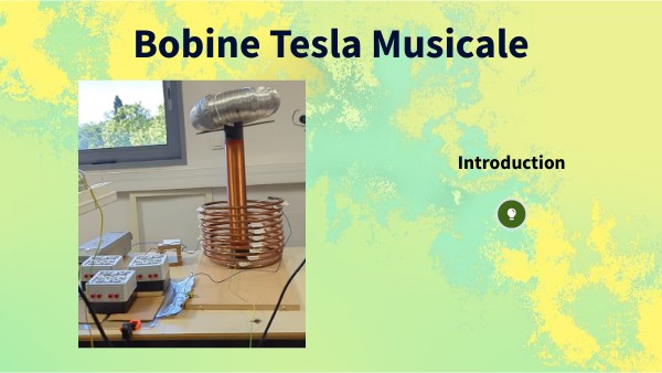La bobine Tesla, ou transformateur de Tesla, est une machine électrique fonctionnant avec du courant alternatif à haute fréquence et permettant de produire de très hautes tensions. Notre but est de réussir à faire des éclairs de 40 cm avec la bobine tesla. Par la suite, nous aimerions faire de la musique avec ses éclairs.