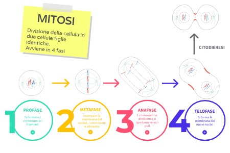 Divisione della cellula in due cellule figlie identiche. Avviene in 4 fasi