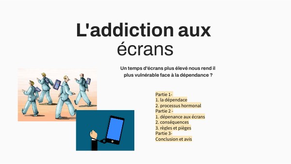 Partie 1- 1. la dépendace 2. processus hormonal Partie 2 - 1. dépenance aux écrans 2. conséquences 3. règles et pièges Partie 3- Conclusion et avis