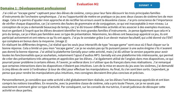 J'ai créé un "escape game" captivant pour des élèves de sixième, conçu pour leur faire découvrir les trois principales familles d'instruments de l'orchestre symphonique. J'ai eu l'opportunité de mettre en pratique ce jeu avec deux classes de sixième lors de mon stage. Cela m'a permis d'ajuster mon approche et de rectifier les erreurs avant la deuxième classe. J'ai pris conscience de l'importance de vérifier chaque diapositive, car j'ai commis des fautes de grammaire et de conjugaison, ce qui est inacceptable à mon niveau. La conception de ce jeu a demandé beaucoup de temps, car j'ai dû trouver différentes activités et les associer à des exemples musicaux, tout en gardant à l'esprit que les élèves devaient identifier les trois grandes familles d'instruments. Je pense également que cela m'a pris du temps, car je n'étais pas familière avec ce type de présentation. Néanmoins, les élèves ont beaucoup apprécié ce jeu, ils ont participé activement et ont retenu ce qu'ils ont appris. J'ai pu le constater grâce à un devoir maison facultatif, qui a été donné via l'ENT qui comptera en bonus dans la moyenne. (image 2) En réalisant les différentes énigmes, j'ai réalisé que les seuls jeux interactifs de type "escape game" sont ceux où il faut cliquer sur la bonne réponse. Cela a limité un peu mon "escape game", car je ne voulais pas qu'ils puissent passer à une autre énigme s'ils n'avaient pas donné la bonne réponse. J'ai utilisé la plateforme Genially pour cette activité, mais j'ai dû utiliser la version payante pour avoir toutes les fonctionnalités que je souhaitais, notamment l'ajout d'audios MP3. Genially est une plateforme très intéressante, qui permet de créer des présentations très attrayantes et appréciées par les élèves. J'ai également utilisé de l'anglais dans mes diapositives, ce qui pourrait poser problème à certains élèves. À l'avenir, je veillerai donc à n'utiliser que du français dans mes réalisations. J'ai remarqué que certaines interactions dans les diapositives n'étaient pas intuitives. Lors de la mise en œuvre du jeu avec les sixièmes, j'ai demandé à cinq élèves de venir à l'ordinateur (à tour de rôle) pour effectuer les manipulations. Au final, ils s'en sont bien sortis. Cependant, je pense que pour rendre les manipulations plus intuitives, mes consignes devraient être plus concises et précises. Personnellement, je considère que cette activité a été globalement bien réalisée, car les élèves l'ont beaucoup appréciée et ont bien compris les notions travaillées. En revanche, avec la première classe de sixième, cela a pris toute l'heure, car je ne savais pas exactement comment gérer ce type d'activité. Par conséquent, sur les conseils de ma tutrice, il serait judicieux de découper cette activité en deux parties.