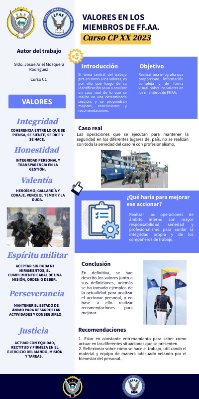 Realizar una infografía que proporcione información compleja y de forma visual sobre los valores en los miembros de FF.AA.