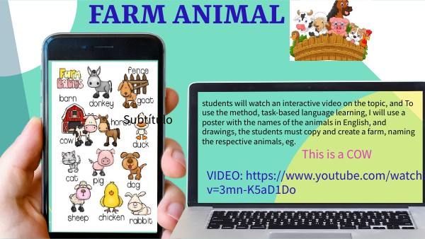 students will watch an interactive video on the topic, and To use the method, task-based language learning, I will use a poster with the names of the animals in English, and drawings, the students must copy and create a farm, naming the respective animals, eg.