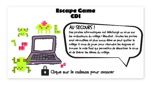 Des pirates informatiques ont téléchargé un virus sur les ordinateurs du collège ! Résultat : toutes les portes sont vérouillées et plus aucun élève ne peut quitter le collège. A vous de jouer pour résoudre les énigmes et trouver le code final qui permettra de désactiver le virus et de libérer les élèves du collège.