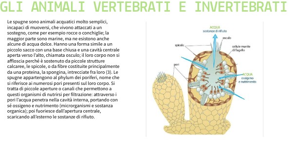 Le spugne sono animali acquatici molto semplici, incapaci di muoversi, che vivono attaccati a un sostegno, come per esempio rocce o conchiglie; la maggior parte sono marine, ma ne esistono anche alcune di acqua dolce. Hanno una forma simile a un piccolo sacco con una base chiusa e una cavità centrale aperta verso l’alto, chiamata osculo; il loro corpo non si affloscia perché è sostenuto da piccole strutture calcaree, le spicole, o da fibre costituite principalmente da una proteina, la spongina, intrecciate fra loro (3).