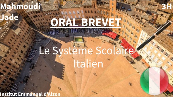 Buongiorno mi chiamo Mahmoudi Jade,sono in classe de terza H,durante questo oral vi presentero come funziona il sistema scolastica in Italia. Ho scelto questo tema perché mi piace molto l'Italia e il materiale italiano.