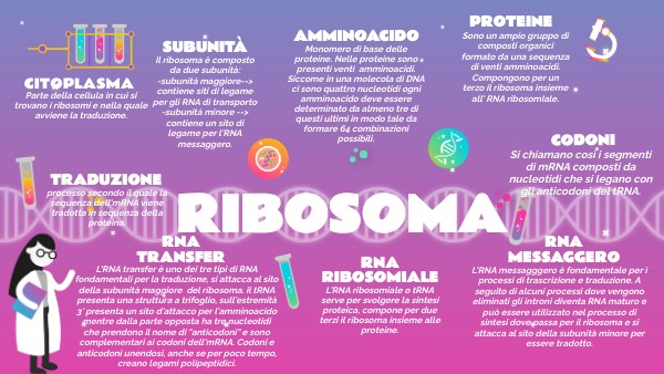 Il ribosoma è composto da due subunità:-subunità maggiore--> contiene siti di legame per gli RNA di transporto -subunità minore --> contiene un sito di legame per l'RNA messaggero.