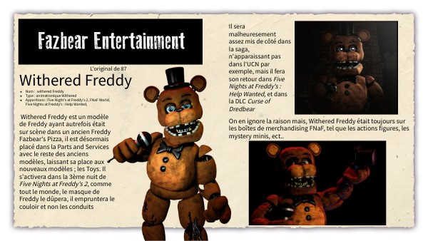 Withered Freddy est un modèle de Freddy ayant autrefois était sur scène dans un ancien Freddy Fazbear's Pizza, il est désormais placé dans la Parts and Services avec le reste des anciens modèles, laissant sa place aux nouveaux modèles ; les Toys. Il s'activera dans la 3ème nuit de Five Nights at Freddy's 2, comme tout le monde, le masque de Freddy le dûpera, il empruntera le couloir et non les conduits