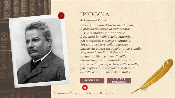Cantava al buio d'aia in aia il gallo.E gracidò nel bosco la cornacchia: il sole si mostrava a finestrelle. Il sol dorò la nebbia della macchia, poi si nascose; e piovve a catinelle. Poi tra il cantare delle raganelle guizzò sui campi un raggio lungo e giallo. Stupiano i rondinotti dell'estate di quel sottile scendere di spille: era un brusiò con languide sorsate e chiazze larghe e picchi a mille a mille; poi singhiozzi, e gocciar rado di stile: di stille d'oro in coppe di cristallo.