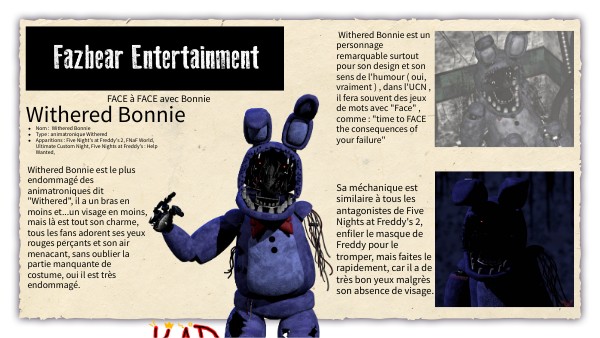 Withered Bonnie est un personnage remarquable surtout pour son design et son sens de l'humour ( oui, vraiment ) , dans l'UCN , il fera souvent des jeux de mots avec "Face" , comme : "time to FACE the consequences of your failure"