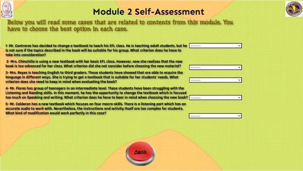 1- Mr. Contreras has decided to change a textbook to teach his EFL class. He is teaching adult students, but he is not sure if the topics described in the book will be suitable for his group. What criterion does he have to take into consideration? 2- Mrs. Chinchilla is using a new textbook with her basic EFL class. However, now she realizes that the new book is too advanced for her class. What criterion did she not consider before choosing the new material? 3- Mrs. Reyes is teaching English to third graders. Those students have showed that are able to acquire the language in different ways. She is trying to get a textbook that is suitable for her students’ needs. What criterion does she need to keep in mind when evaluating the book? 4- Mr. Flores has group of teenagers in an intermediate level. These students have been struggling with the Listening and Reading skills. In this moment, he has the opportunity to change the textbook which is focused too much on Speaking and writing. What criterion does he have to bear in mind when choosing the new book? 5- Mr. Calderon has a new textbook which focuses on four macro-skills. There is a listening part which has an accurate audio to work with. Nevertheless, the instructions and activity itself are too complex for students. What kind of modification would work perfectly in this case?