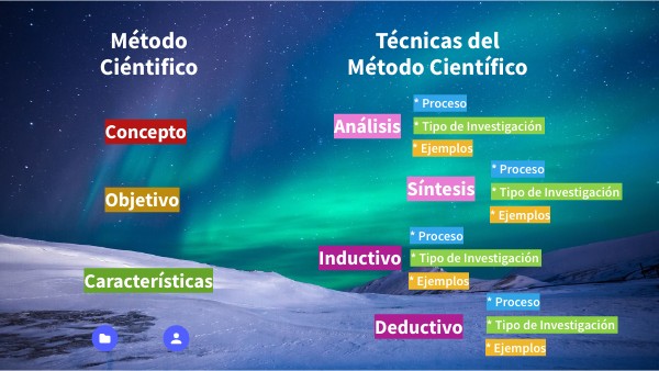 Organizador gráfico sobre el método científico en donde se incluye: • Concepto, objetivo y características del método científico. • Definición, proceso, tipo de investigaciones donde se emplea y ejemplo de cada una de las técnicas del método científico (análisis, síntesis, inferencia y deducción).