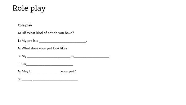 A: What does your pet look like?B: My ________(pet) is_________________(description)