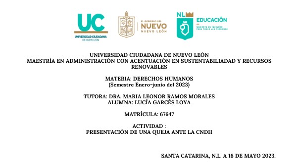 UNIVERSIDAD CIUDADANA DE NUEVO LEÓN MAESTRÍA EN ADMINISTRACIÓN CON ACENTUACIÓN EN SUSTENTABILIADAD Y RECURSOS RENOVABLES MATERIA: DERECHOS HUMANOS (Semestre Enero-junio del 2023) TUTORA: DRA. MARIA LEONOR RAMOS MORALES ALUMNA: LUCÍA GARCÉS LOYA MATRÍCULA: 67647 ACTIVIDAD : PRESENTACIÓN DE UNA QUEJA ANTE LA CNDH SANTA CATARINA, N.L. A 16 DE MAYO 2023.